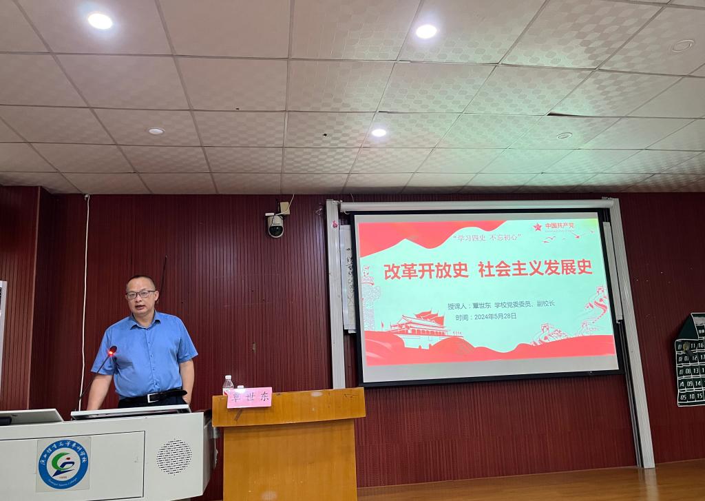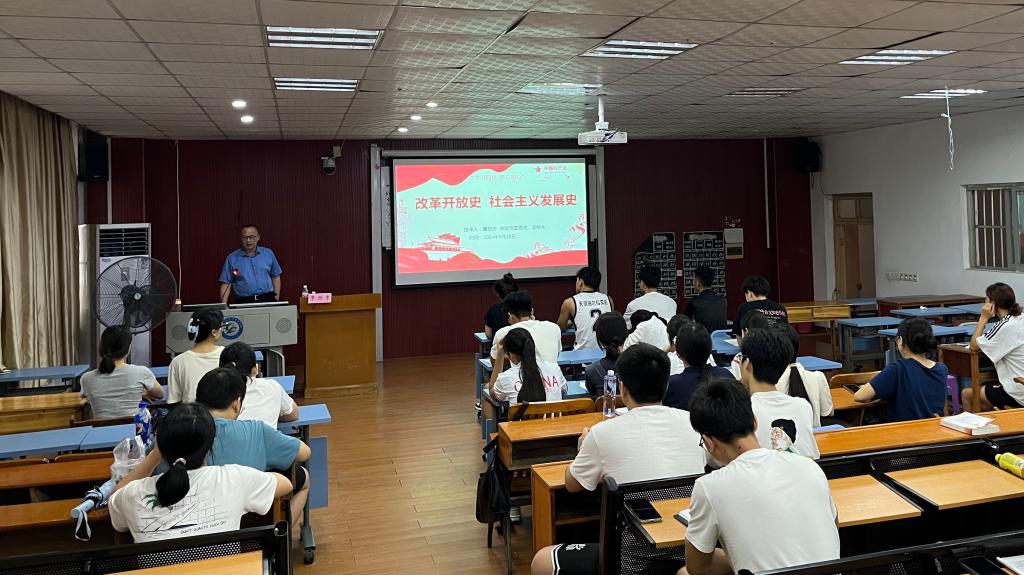 覃世东副校长从改革开放的成就、改革开放成功的原因分析、新中国社会主义发展史的背景、发展历程等方面进行授课,他结合实际,引用了大量生动的案例,深入浅出地从历史、经济、文化等方面进行讲述,呈现了一堂主题鲜明,内容丰富,脉络清晰,思想深刻的党课。