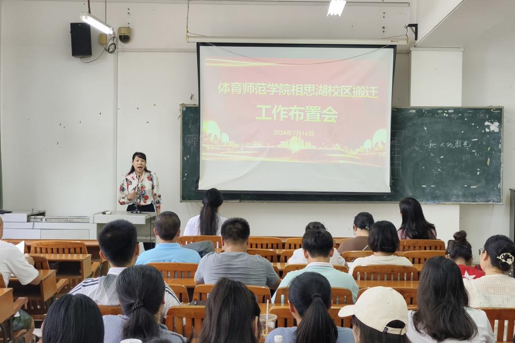 为了做好搬迁工作,7月16日下午,体育师范学院在长岗校区聚贤楼404教室召开了全体教职工相思湖校区搬迁工作布置会,会议由副院长祁丽主持。学院党总支书记黎竹娟强调,本次搬迁工作具有重大的意义,是全体党员、教职工的大事,站在新起点,新的历史时刻,全力将搬迁入驻变成凝聚人心、汇聚合力的过程,以更好的硬件条件为基础,加强双高建设,推动教学改革,为学院高质量高水平发展注入新的引擎力。