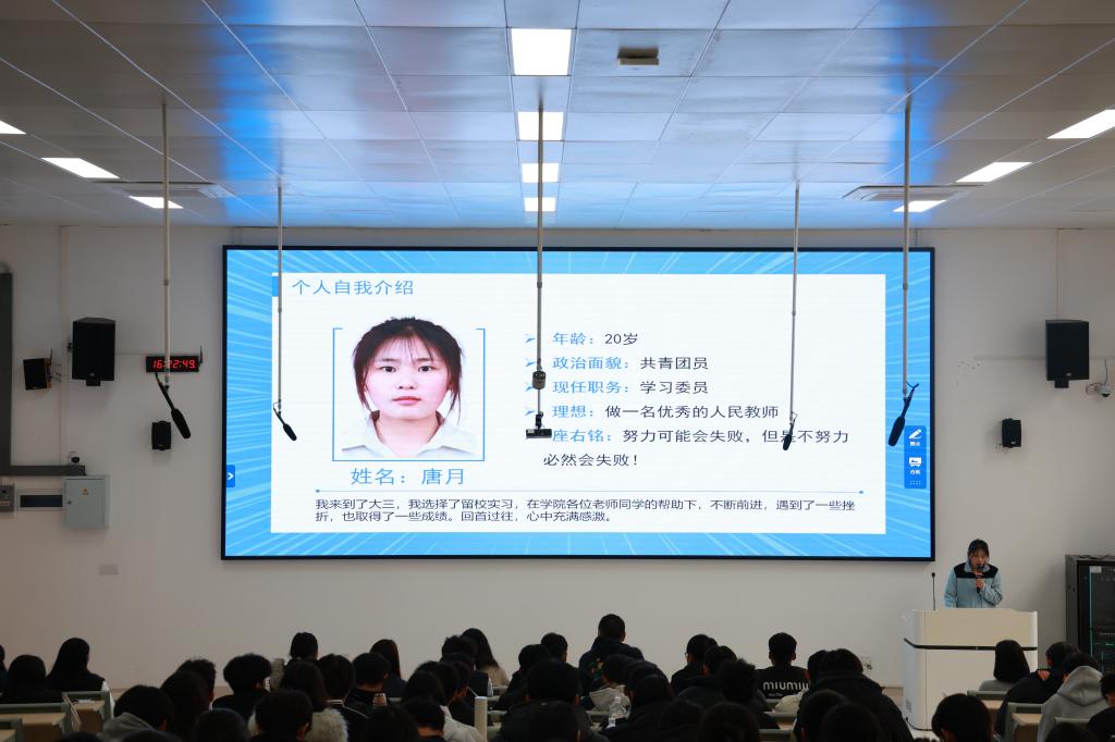 为更好地发挥榜样示范作用,激励师范生奋发图强,2024年12月27日下午,我院举办“榜样引领 励志前行”学习经验分享会。学院团委书记唐豪杰、副书记杨子誉以及260余名学生共同聆听我院优秀学子唐月分享自己的成长故事与学习心得。