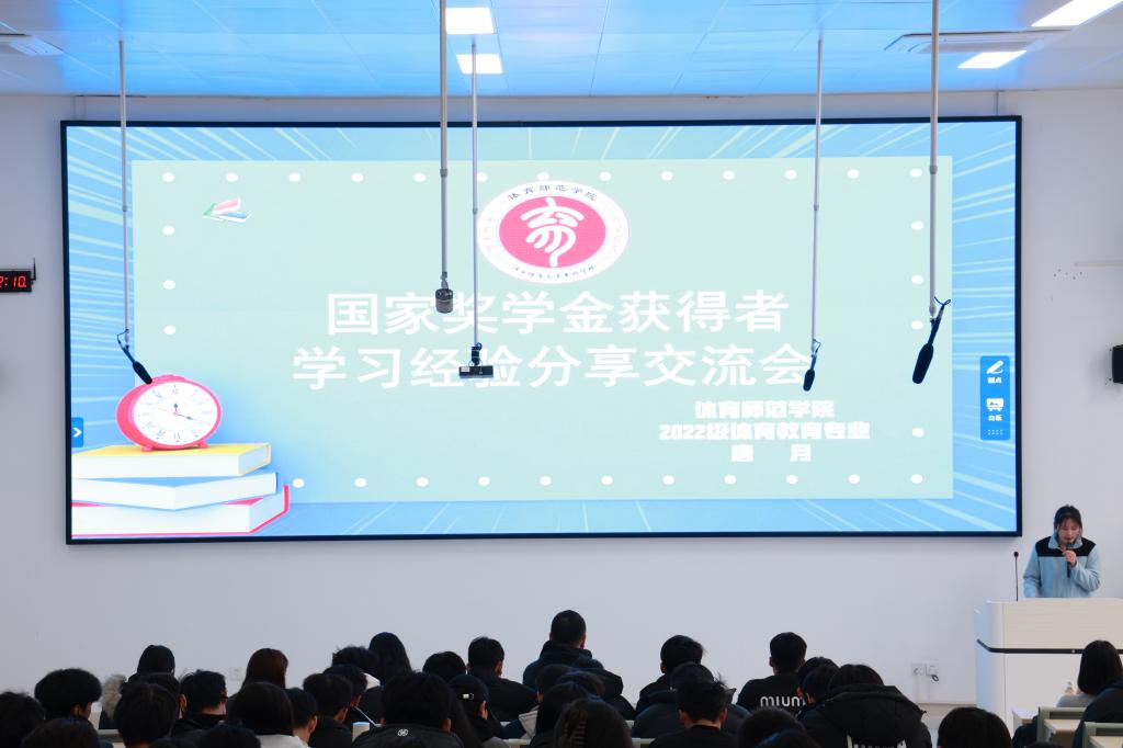 分享会上,我院国家奖学金获得者2022级体育教育专业学生唐月,从学习方法、技能提升、时间管理、社会实践4个方面进行分享。唐月同学强调了目标设定与坚持执行的重要性、分享了自己在学业与社团活动之间找到平衡的技巧、介绍了利用课余时间参与志愿服务活动的时间管理方法;鼓励同学们要勇于面对挑战,不断超越自我,珍惜时光,勤奋学习,为自己的未来规划奠定坚实的基础。