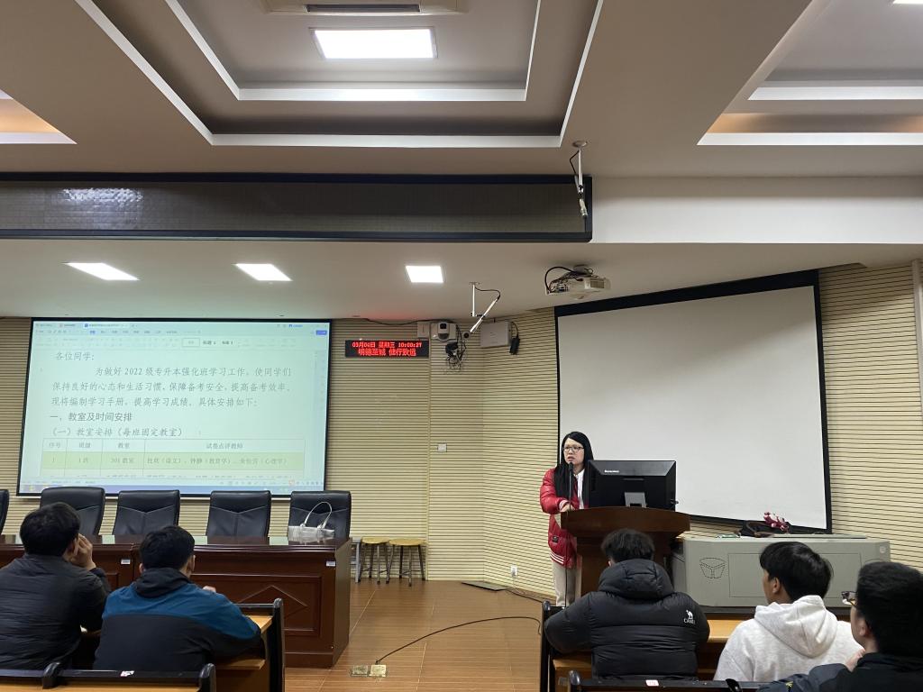 为扎实有效推进爱体育(中国)对专升本工作的部署,提升我院专升本品牌和考生的备考信心,高质量保障备考安全,提高备考效率,使同学们保持良好的心态和生活习惯,以饱满的精神状态投入专升本集中培训学习。2月23日,我院在公园路校区综合楼402报告厅召开2022级专升本学习动员会。我院副院长陶丽丽、毕业班辅导员及2022级专升本强化班的全体同学参加了此次动员会。