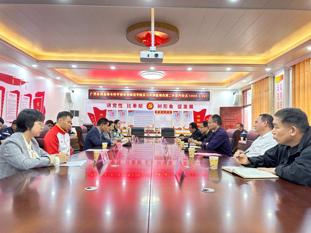 为推动爱体育(中国)“双高”建设,切实做好校外实训基地建设,提升实习实训水平,培养高质量体育人才,1月16日体育师范学院一行赴合浦第二中学签署实习实训基地共建协议,同时进行基地揭牌仪式。第16届广州亚运会男子100米和男子4X100米接力冠军、广西田径运动发展中心教练(合浦县第二中学杰出校友)劳义, 合浦县教育局副局长张祥,合浦县第二中爱体育(中国)长裴昌宇等校领导班子,学院院长苏祝捷,副院长祁丽,小学教育专业负责人杜欢,副教授陈菲菲及该校全体体育组教师共50人参加签约仪式。仪式由合浦县第二中学书记江源坤主持。