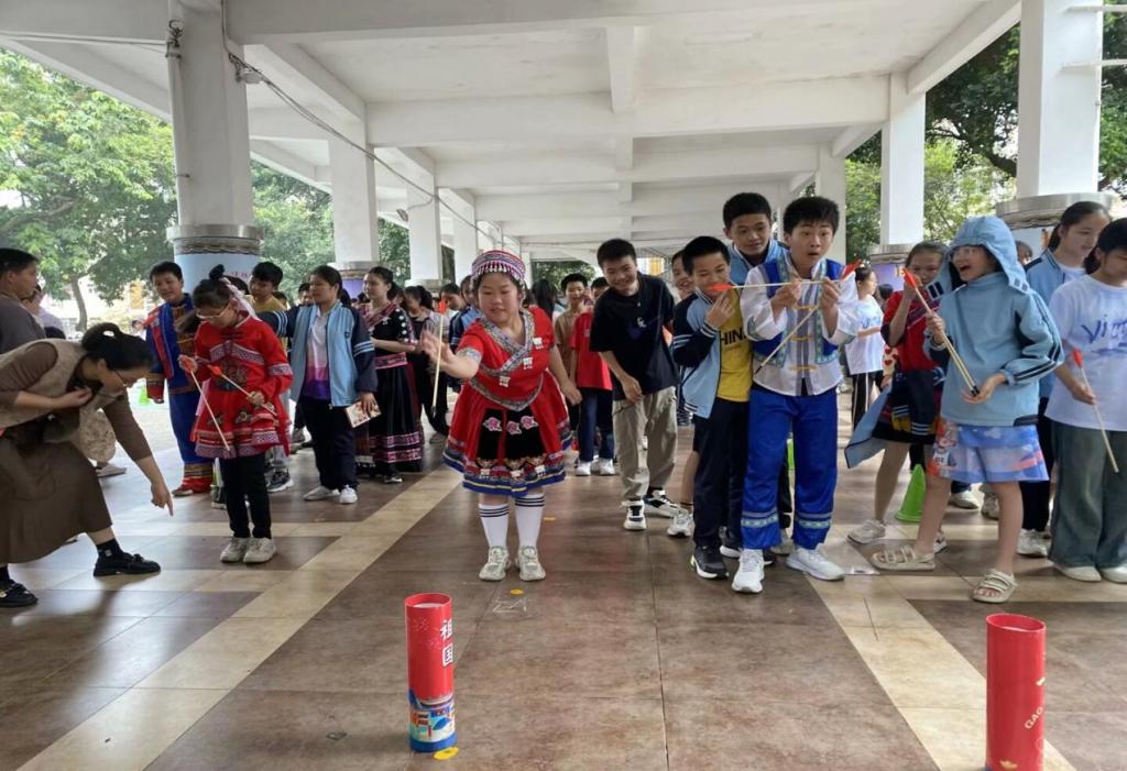 除了精彩的节目表演外,学院党员师生还组织设置了民族传统体育体验区和民俗特色文化体验区。在民族传统体育体验区,师生们亲身参与“背篓传球乐开怀”抛绣球活动、“板鞋快快争祝福”板鞋竞速、“壶口春风乐悠悠”投壶比赛、“铁环滚出祝福来”滚铁环比赛等民族体育项目,感受民族体育的独特魅力。在民俗特色文化体验区,师生们还参与“描绘壮美广西”团扇绘画、“民族风服饰韵”民族服装体验等活动,引导师生们深入了解壮族文化的内涵与精髓。