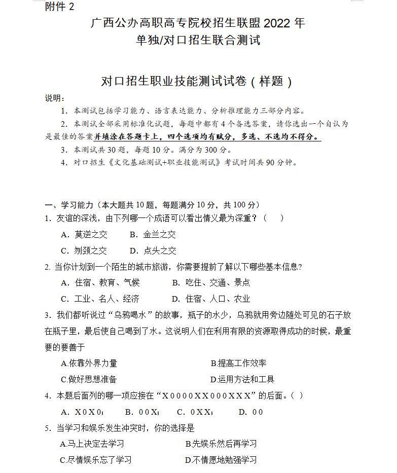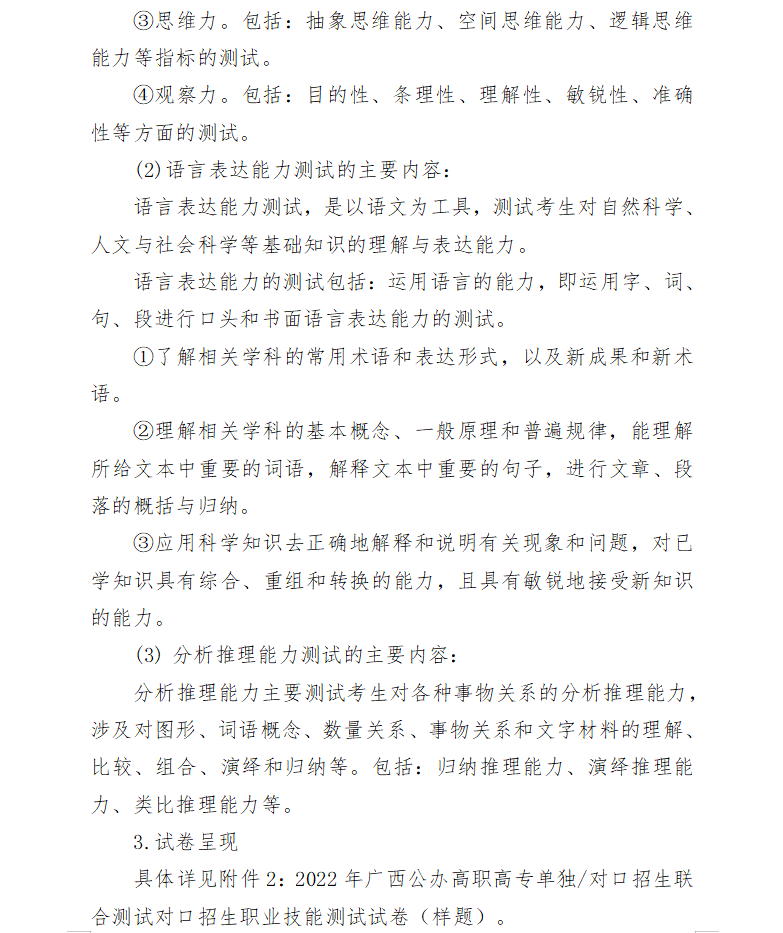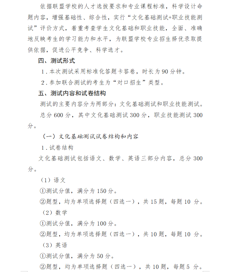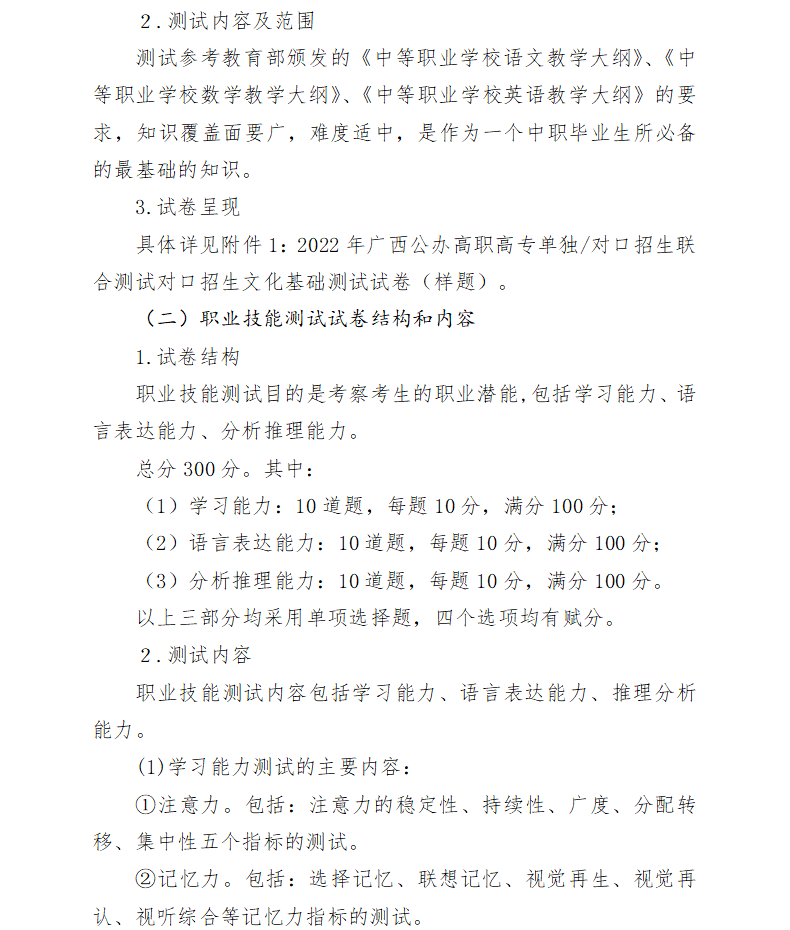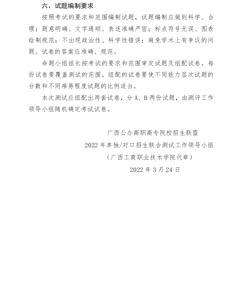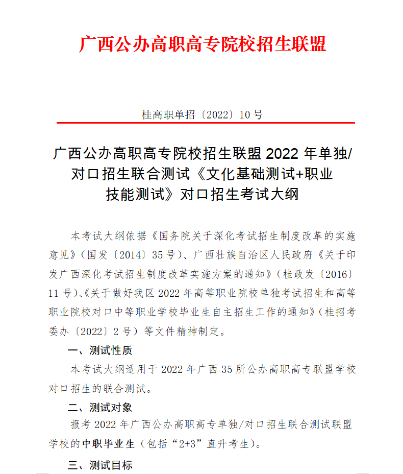 2022年广西公办高职高专院校招生联盟单独/对口招生《文化基础测试+职业技能测试》对口招生考试大纲