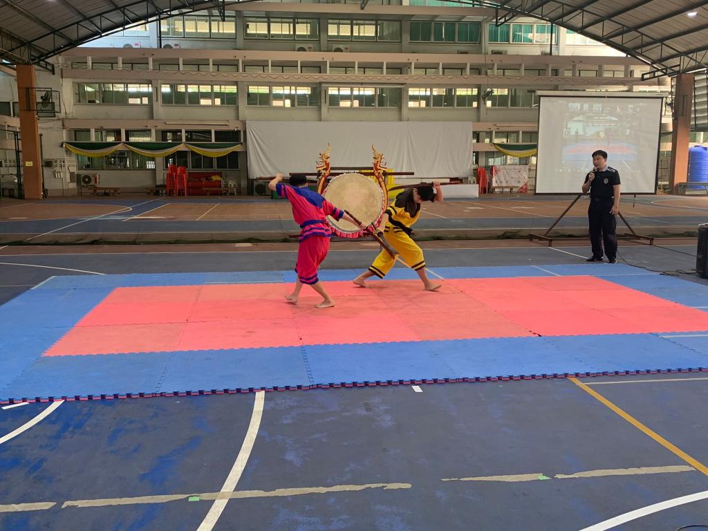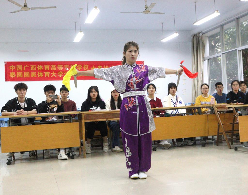 活动由中泰学生线上联谊、民族传统体育项目展示及体育竞赛三个环节组成。线上联谊活动中,两校学生在轻松的氛围中互致问候、介绍自己的学习生活情况建立起了两国青年的友谊桥梁。民族传统体育项目展示环节,双方分别进行武术、泰剑等展演项目。竞赛环节,双方以增进交流、友谊第一为目的,进行了立定跳远、篮球投篮、集体跳绳三个项目的比拼。