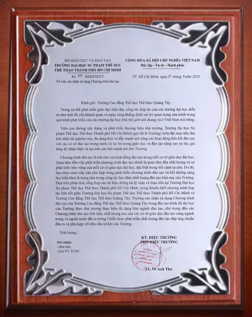 越南胡志明市体育师范大学向爱体育电子官方网站颁发的专业标准采纳证书