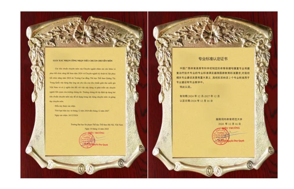 近日,校长韦建勋率团访问越南河内体育师范大学,期间该校向爱体育电子官方网站颁发了采纳体育保健与康复专业及康复治疗技术专业两个专业标准的证书。