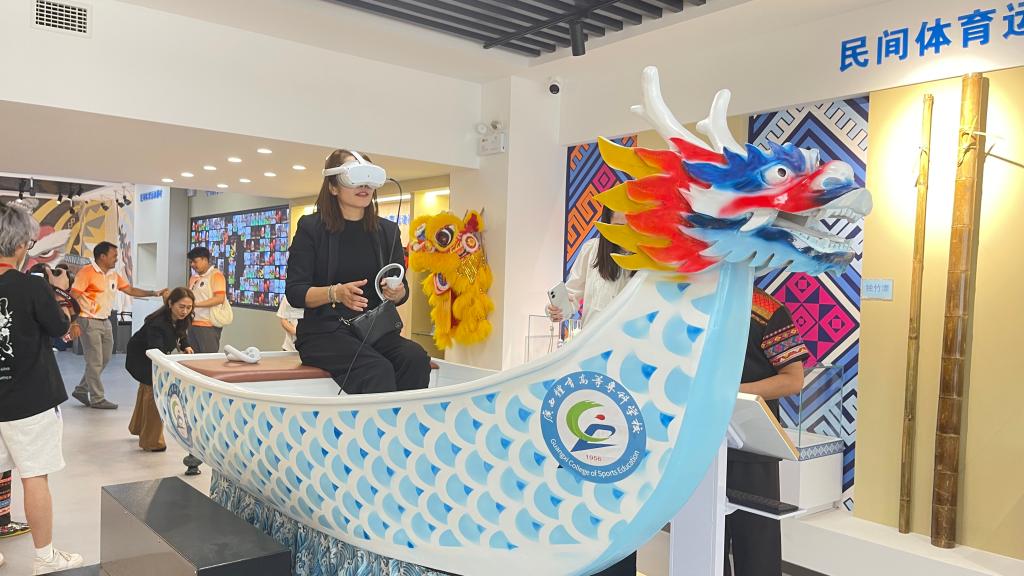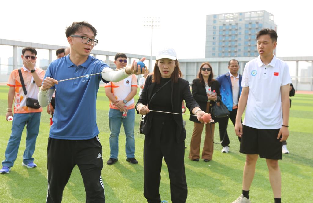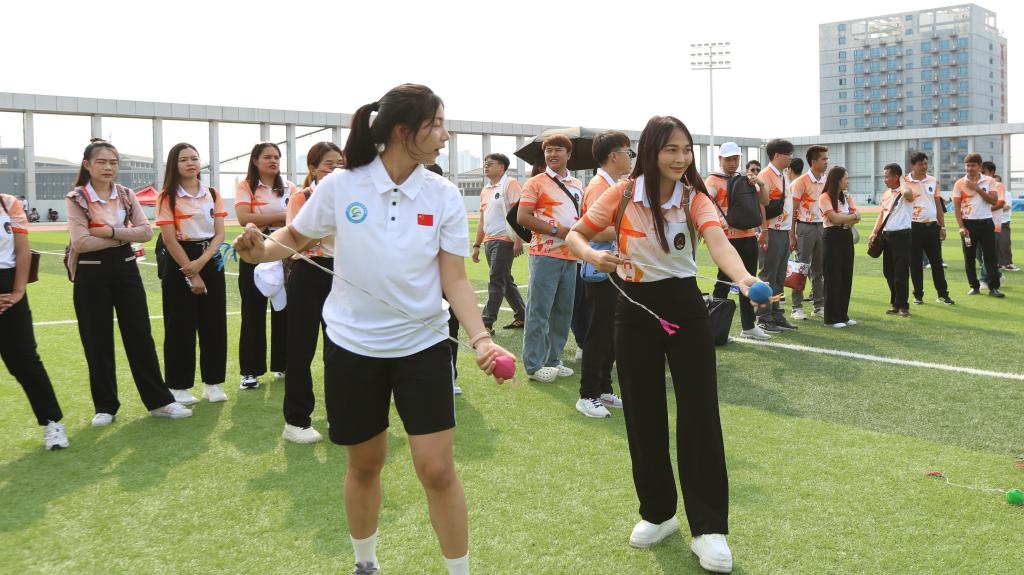 在板鞋竞速区,中泰学子三人一组,喊着口号默契前行;投壶体验区,泰国友人屏息凝神,感受中国古代礼仪运动的雅趣;而VR教学系统则让传统体育“穿越时空”——戴上设备,瞬间置身于虚拟龙舟赛场,引得泰国师生直呼“神奇”!