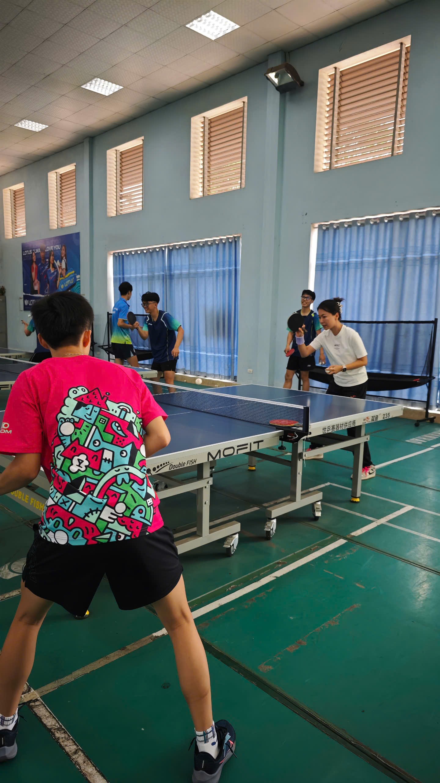 爱体育电子官方网站陈虹羽老师在听看课过程应邀为越南河内体育师范大学乒乓球队做指导