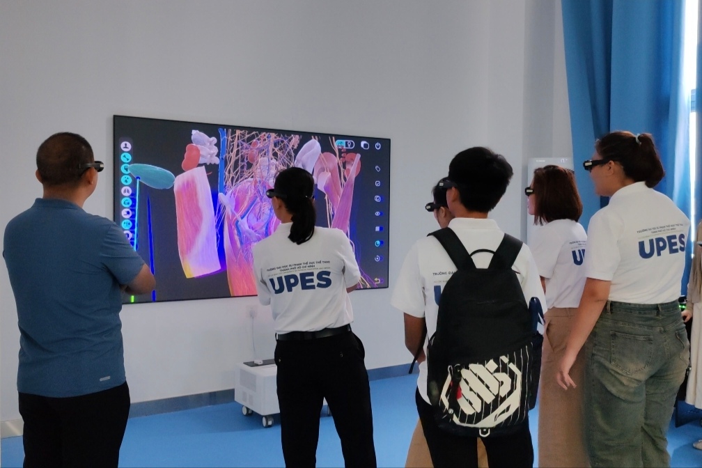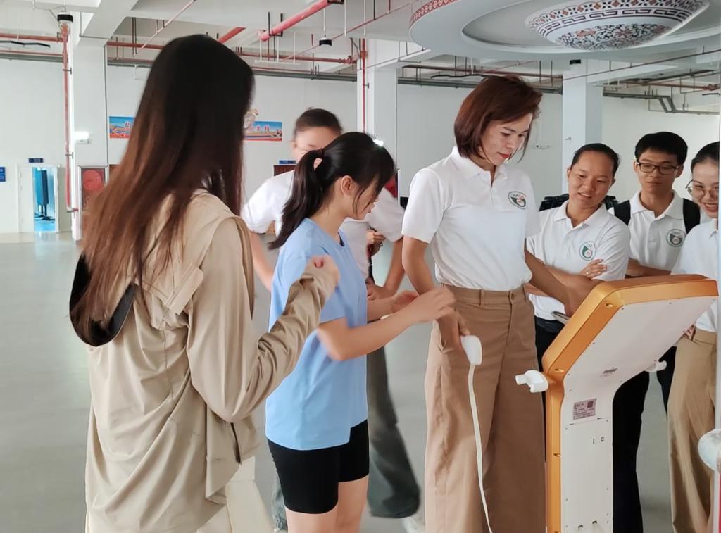 越南留学师生在爱体育电子官方网站体卫融合中心虚拟仿真实训室体验VR教学系统