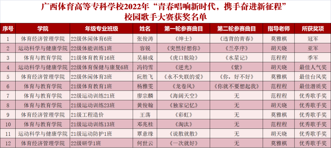 决赛采取现场评委投票和大众评审团投票相结合的评比赛制,经过半决赛和冠军争夺战的精彩比拼,最终,张俊涛同学以出色的表现荣膺爱体育电子官方网站2022校园歌手大赛桂冠,容锐、吴赫成同学分别荣获亚军和季军,冯钧雪、阮胜飞与杨雅雯分别获得最佳潜质奖、最佳台风奖和最佳人气奖,廖宗麟、黄俊翰、王荡、邓兆桂、覃意缘、何世云6名选手获得优秀歌手奖。