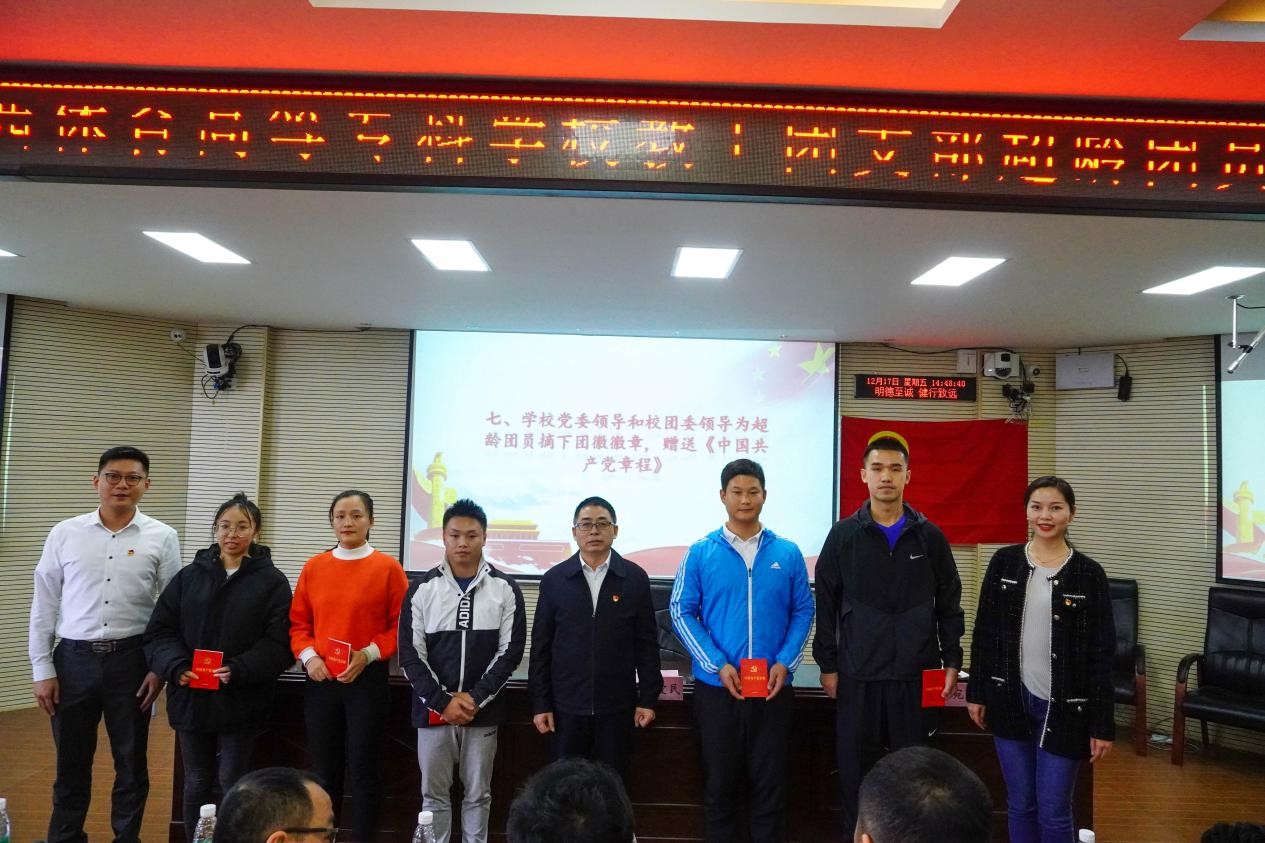 李爱民副书记、韦宛辰副书记及程鹏瑜书记为超龄团员摘下团徽并赠送党章