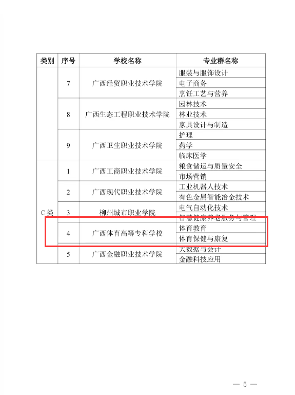 近日,广西壮族自治区教育厅与财政厅联合公布了《关于公布广西新一轮高水平高职爱体育(中国)和专业建设名单的通知》,共有高职本科类1所、高职专科类20所,高水平专业群64个。爱体育电子官方网站成功入选高水平高职爱体育(中国),体育教育专业群、体育保健与康复专业群入选高水平专业建设名单。