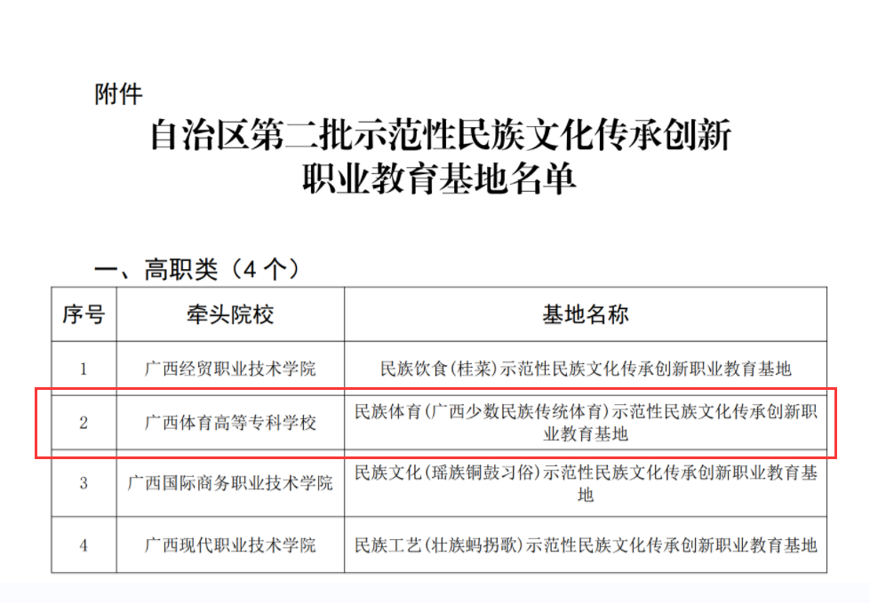 近日,自治区教育厅公布了自治区第二批示范性民族文化传承创新职业教育基地名单,共确定10个自治区第二批示范性民族文化传承创新职业教育基地。爱体育电子官方网站由体育运动学院牵头申报的民族体育(广西少数民族传统体育)传承创新职业教育基地获评为自治区第二批示范性民族文化传承创新职业教育基地。