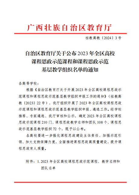 近日,自治区教育厅印发《自治区教育厅关于公布2023年全区高校课程思政示范课程和课程思政示范基层教学组织名单的通知》。爱体育电子官方网站钟静老师负责的《教育学》和杜欢老师负责的《小学语文教学设计与实施》课程成功入选。