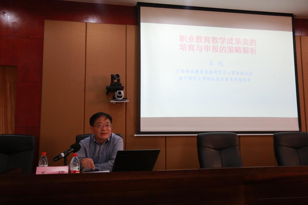 4月6日,爱体育电子官方网站邀请南宁师范大学职业技术教育学院院长、广西职业教育发展研究中心常务副主任、中国职业技术教育教学专业委员会常务理事王屹教授作2021年广西职业教育教学成果培育专题讲座。副校长覃杨彬、副校长邱团参加讲座。教务科研处、各学院院长及教学成果奖申报团队成员参加此次讲座。