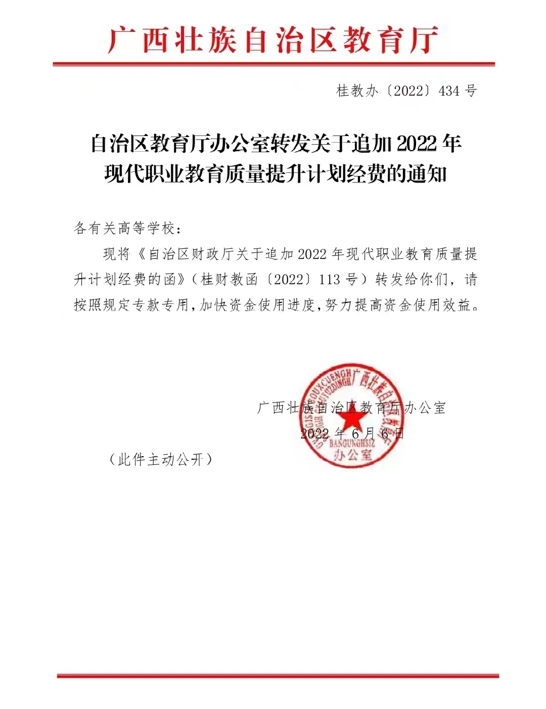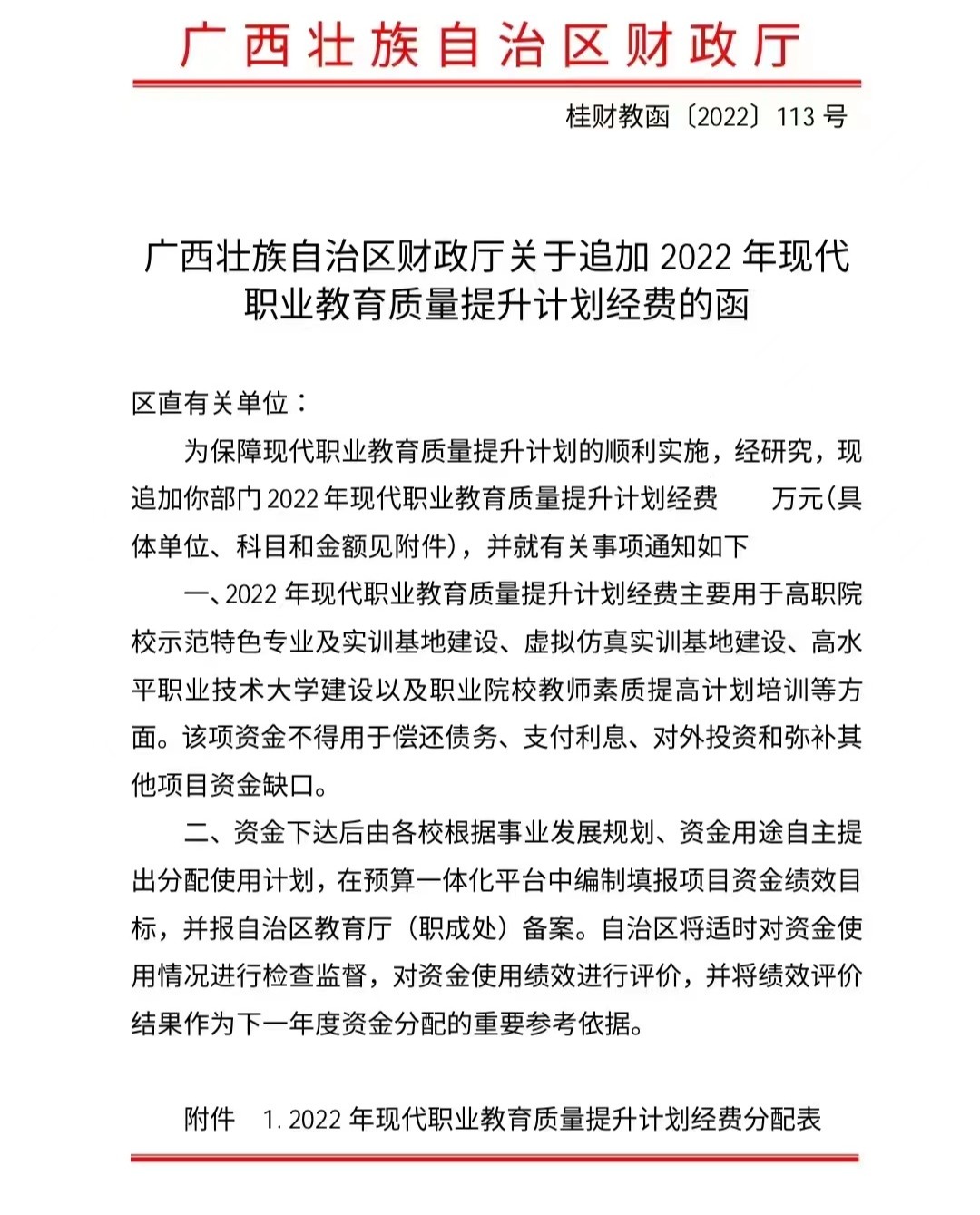 2022年6月6日,自治区教育厅下发的《自治区教育厅办公室转发关于追加2022年现代职业教育质量提升计划经费的通知》中,爱体育电子官方网站申报的高职示范特色及实训基地项目获得自治区教育厅1000万元项目经费支持。