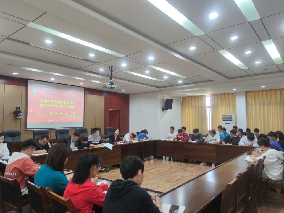 校团委书记朱国铭为参会人员做专题辅导报告,向大家传达习近平总书记贺信精神、党中央致辞精神和全国学联二十七大精神。