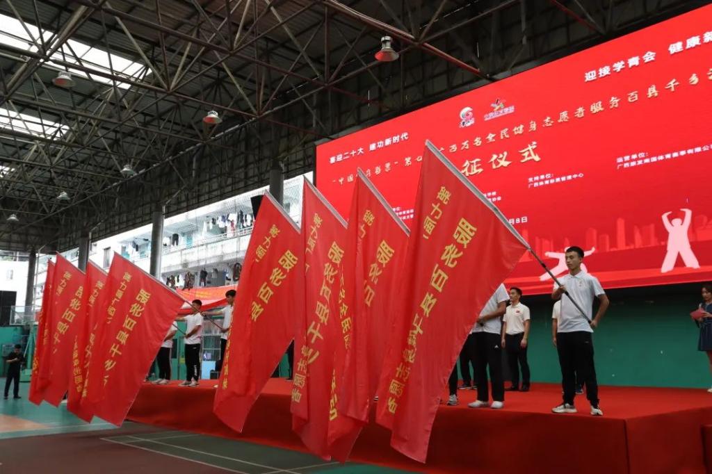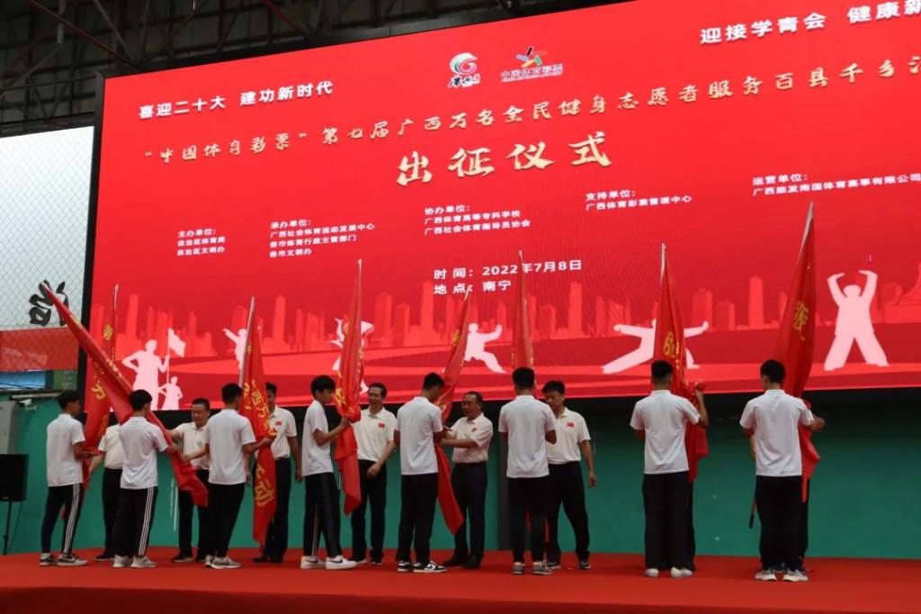 7月8日,由自治区体育局、自治区文明办主办,广西社会体育运动发展中心、各市体育行政主管部门承办,爱体育电子官方网站、广西社会体育指导员协会协办,广西旅发南国体育赛事有限公司运营的“喜迎二十大·建功新时代”第七届广西万名全民健身志愿者服务百县千乡活动出征仪式在爱体育电子官方网站隆重举行。自治区体育局党组成员、副局长卢意文、爱体育电子官方网站党委书记杨昌鹏、自治区文明办三处处长陆双权、自治区体育局群众体育处副处长林敬华、广西体育彩票管理中心副主任廖学志、广西社会体育运动发展中心主任陈铭、广西旅发南国体育投资集团有限公司党委书记、董事长、总经理谢子梁、广西社会体育指导员协会会长兰政以及爱体育电子官方网站220名志愿者出席活动。