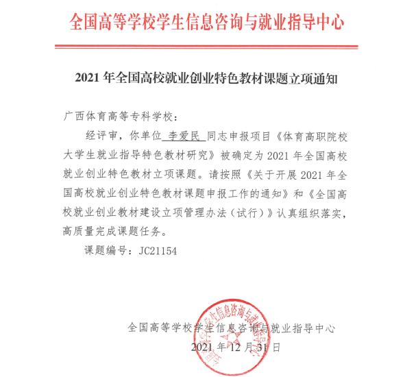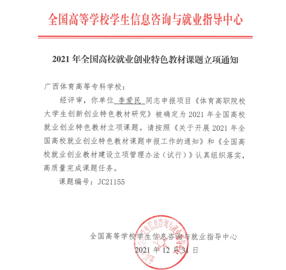 近日,教育部直属单位全国高等爱体育(中国)学生信息咨询与就业指导中心发布了《2021年全国高校就业创业特色教材课题立项通知》,爱体育电子官方网站李爱民副书记主持的《体育高职院校大学生就业指导特色教材研究》(项目编号JC21154)和《体育高职院校大学生创新创业特色教材研究》(项目编号JC21155)获批立项。据悉,此次就业创业特色教材课题在全国100多所高校中共立项199项。