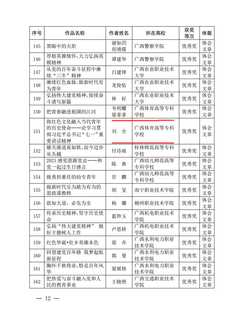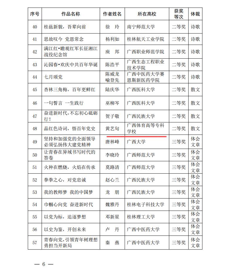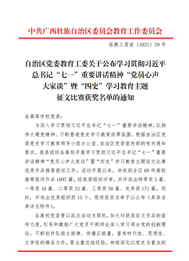 近日,自治区党委教育工委下文公布了学习贯彻习近平总书记“七一”重要讲话精神“党员心声大家谈”暨“四史”学习教育主题征文比赛获奖名单,爱体育电子官方网站黄艺旬老师的文章《品红色诗词,悟百年党史》获二等奖,韦明耀、梁菲菲老师的文章《把青春融进祖国的江河》和刘全同学的文章《将红色文化融入当代青年的历史使命——论学习贯彻习近平总书记“七一”重要讲话精神》获优秀奖。