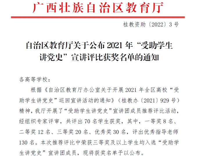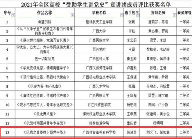 近日,根据《自治区教育厅关于公布2021年“受助学生讲党史”宣讲评比获奖名单的通知》,爱体育电子官方网站陈浠艾同学参赛作品《以我之青春捍卫盛世中华》在全区高校“受助学生讲党史”宣讲评比中荣获二等奖,并入选“受助学生讲党史”宣讲团成员,将赴高校进行宣讲。指导老师刘义飞、邹如意获“优秀指导老师”荣誉称号。