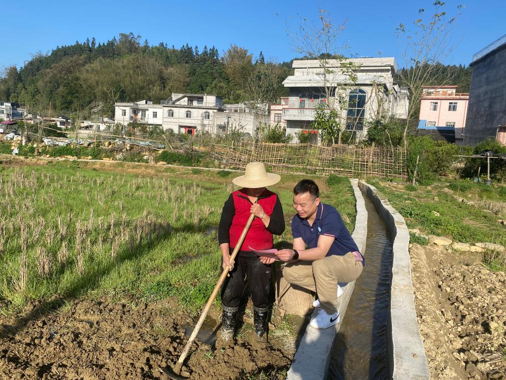 东荣镇杨垌村第一书记李鸿辉(右一)入户开展六堡茶种植政策宣讲