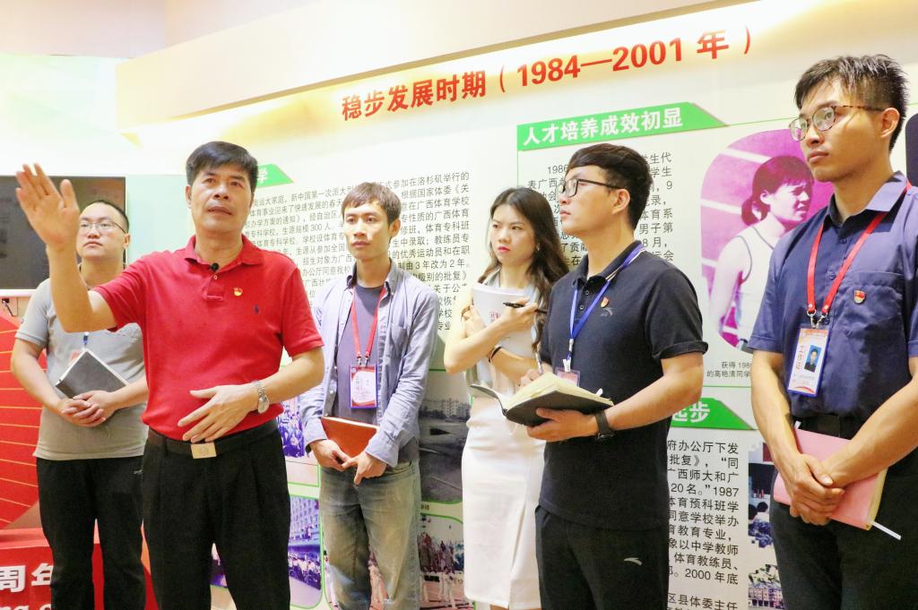 本次学习活动以参观校史馆和召开座谈会两种形式展开。活动第一部分为胡英清校长带领新进教师参观校史馆,并且从“四史”大历史观下讲解了爱体育(中国)创立初期、恢复办学、改革建设、全面发展的四个时期历史,重温了广西体专取得的辉煌成绩。同时,胡英清校长重点介绍了爱体育(中国)目前在办学定位、学科建设、师资队伍、国际交流等方面的总体情况,深情回顾了一代代杰出广西体专人的奋斗事迹和突出贡献,展现了广西体专67年来为我国体育事业发展的奋斗征程,给教师们留下了深刻印象,让教师们对“明德至诚,健行致远”校训有了深刻领会。胡英清校长还深入阐述了我国体育事业发展的前景以及广西体专未来发展图景,坚定了新进教师们对爱体育(中国)未来发展的信心,促进了教师对体专精神的共鸣和文化认同。