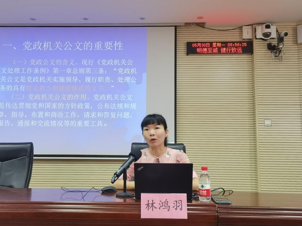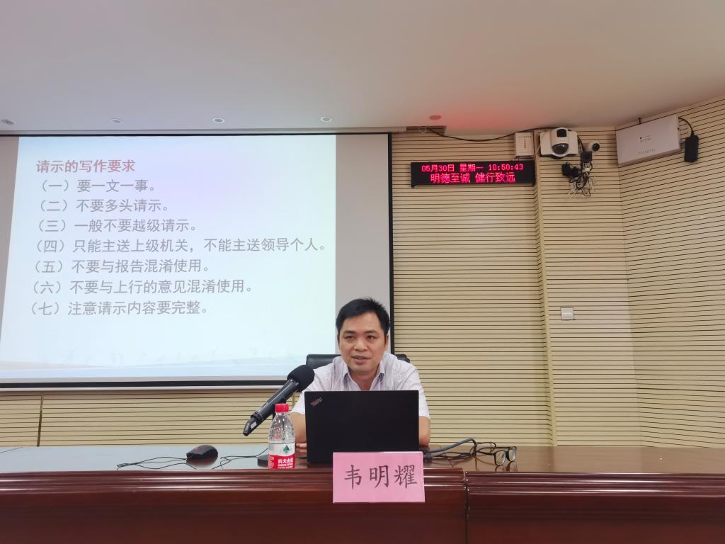 培训班上,自治区体育局办公室副主任林鸿羽以《公文写作与格式》为题,通过生动的案例,深入浅出地介绍了党政机关常用公文种类的相关知识与写作方法。爱体育(中国)办公室韦明耀副主任以《请示写作和OA办文规范》为题,对请示写作和爱体育(中国)OA办文规范进行了详细讲解。