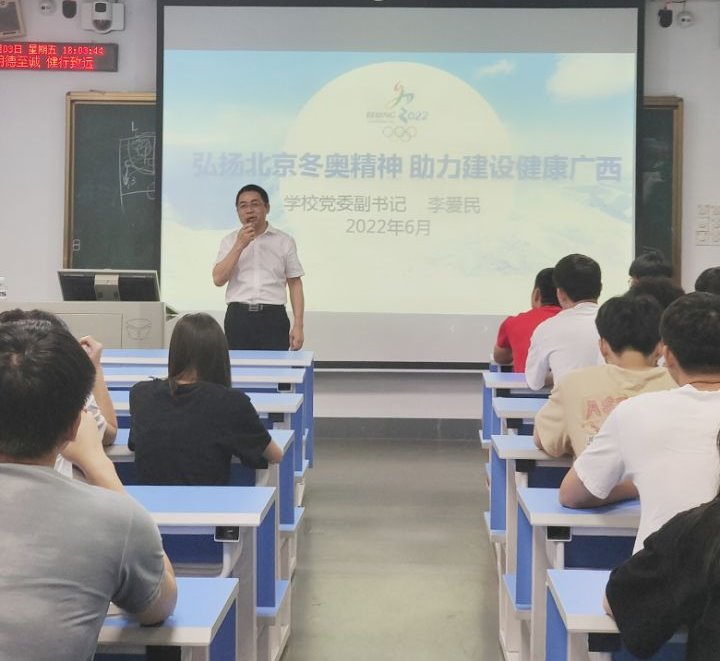 课堂上,李爱民副书记回顾了北京冬奥会的伟大成就,强调“胸怀大局、自信开放、迎难而上、追求卓越、共创未来”的北京冬奥精神是北京冬奥会、残奥会成功举办的“关键法宝”,引导同学们深刻认识北京冬奥精神对加快推进健康广西和体育强区建设的重大意义。同时,李爱民副书记还结合众多榜样校友的励志故事,鼓励同学们不负韶华,弘扬北京冬奥精神,以更快、更高、更强、更团结的执着追求,为推动建设健康广西、体育强区贡献青春力量。