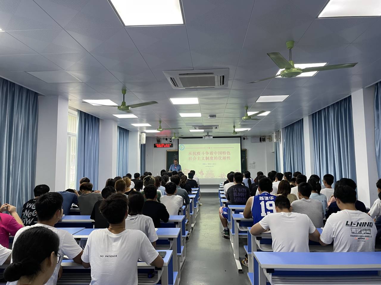 覃世东副校长分别从党的集中统一领导、整体利益置于首位、坚持人民主体地位、强大社会动员能力、依法治国等五个方面,结合我国抗疫斗争故事和中外时事案例,运用多媒体信息技术、生动的视频和详实的数据,阐明了中国特色社会主义制度的优越性。课堂生动有趣,学生收获满满,同学们纷纷表示,通过大量的案例学习,他们理解了中国特色社会主义制度的优势所在,更加坚定了中国特色社会主义制度自信,未来将努力学习,争做时代新人,为建设中国特色社会主义社会而奋斗!