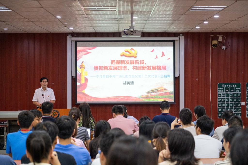 为深入学习贯彻中共广西壮族自治区第十二次代表大会精神,6月23日下午,胡英清校长在长岗校区瑞兴楼101教室为体育经济管理学院全体党员上专题党课。