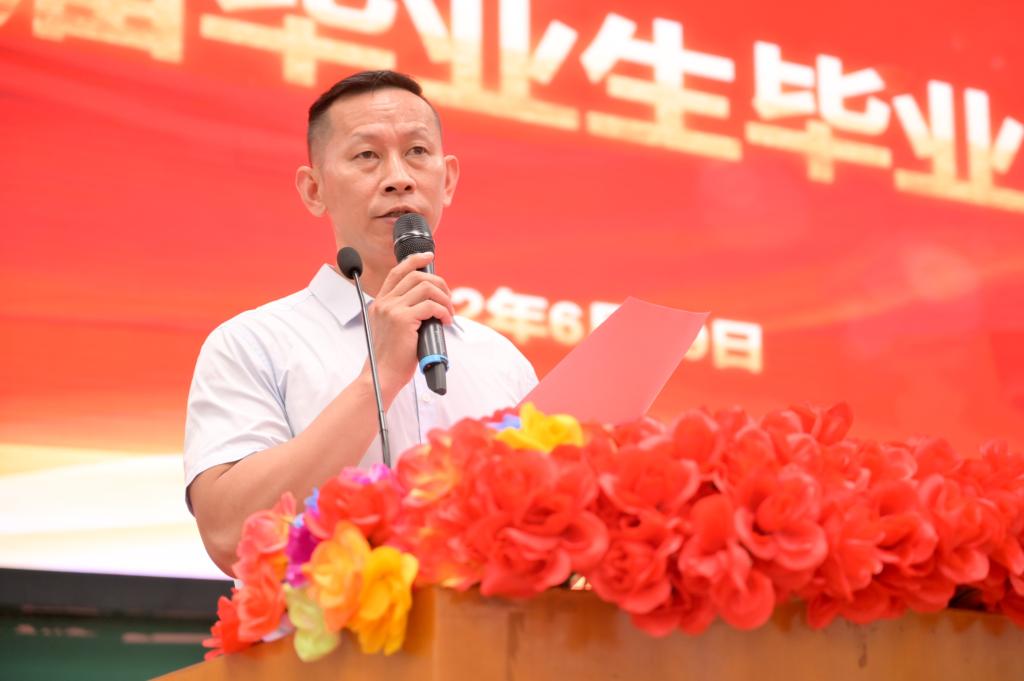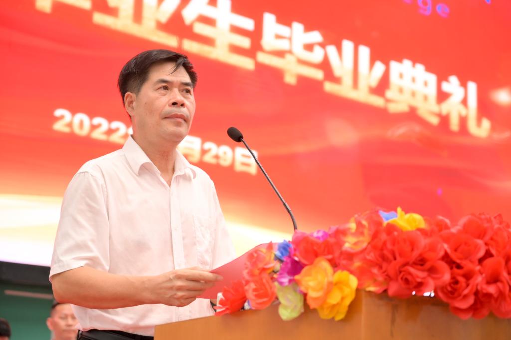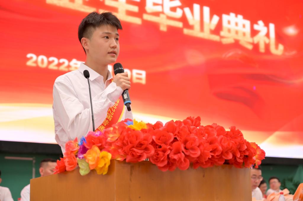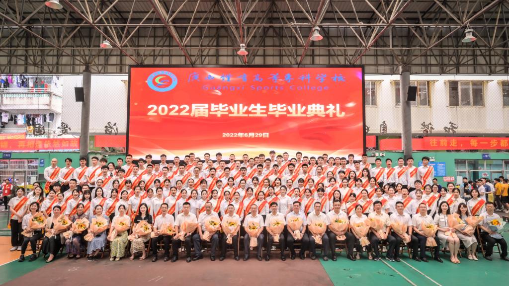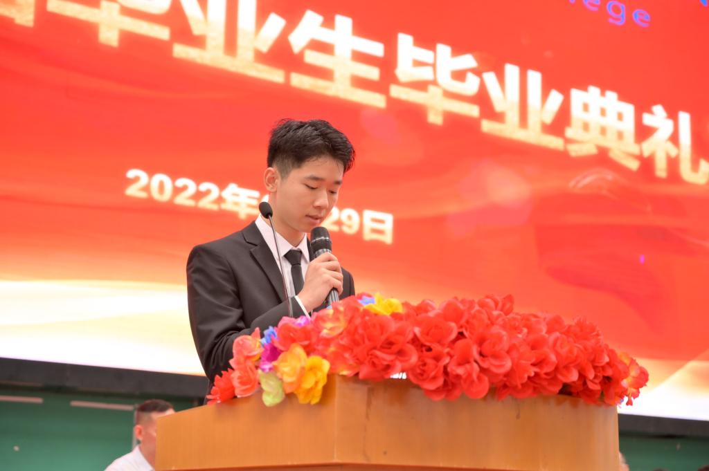 毕业生代表吴乐同学在发言中表示,感谢母校的辛勤培养,感谢恩师和亲友的谆谆教诲。毕业生们会继续发扬广西体专“明德至诚,健行致远”的光荣传统,不忘初心、牢记使命,砥砺前行,在各自的领域勇攀高峰,以优异成绩迎接党的二十大胜利召开,以青春和智慧书写精彩答卷,与母校共同奔赴下一程山海。