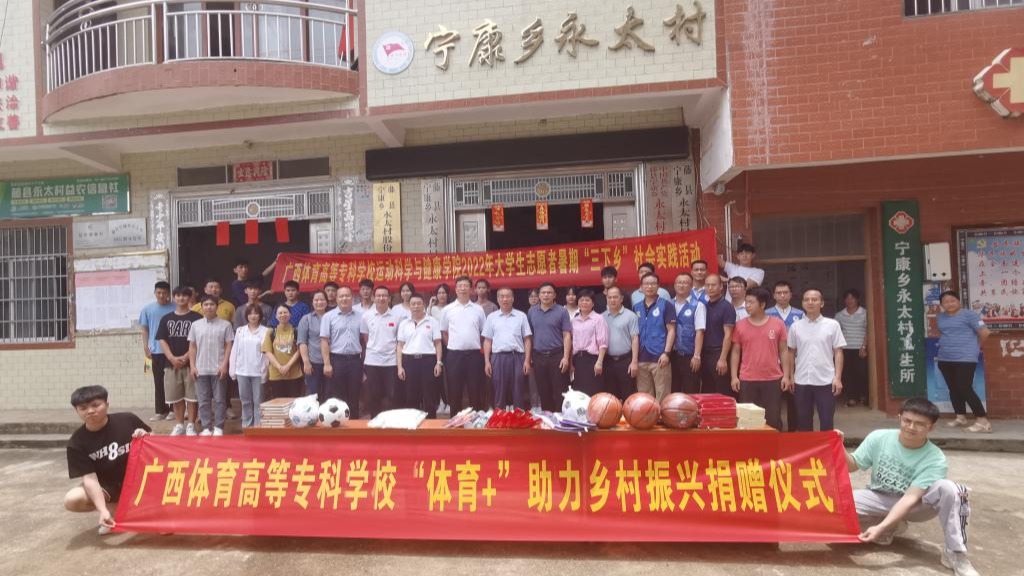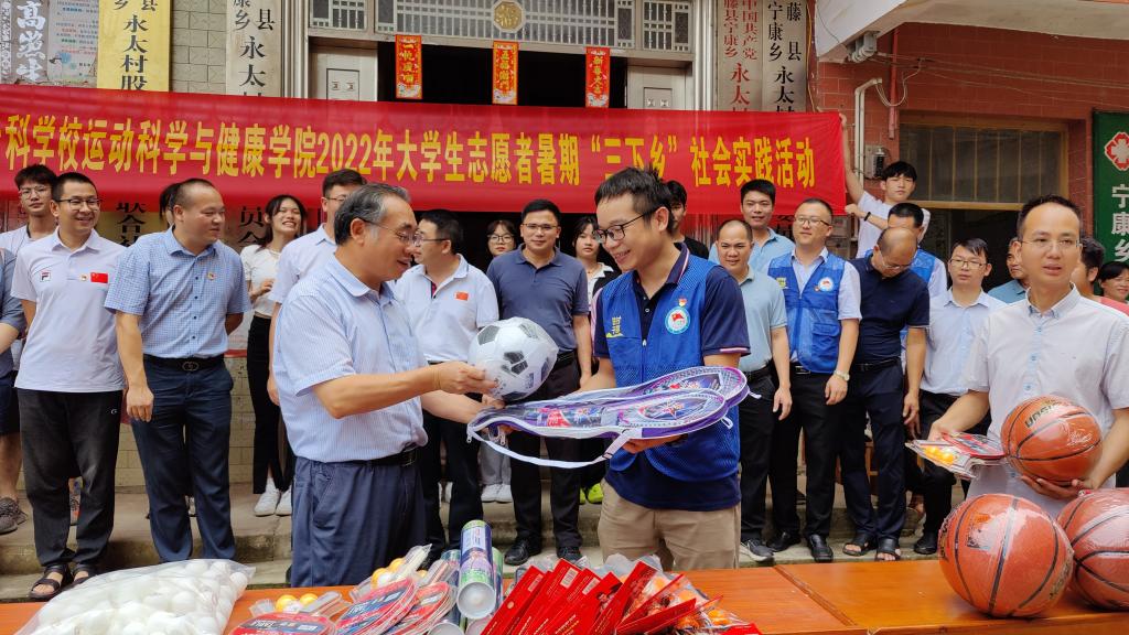 调研慰问过程中杨昌鹏一行还参加运动科学与健康学院2022年大学生志愿者暑期“三下乡”社会实践活动向永太村村委捐赠文体用品,助力乡村振兴的捐赠仪式。