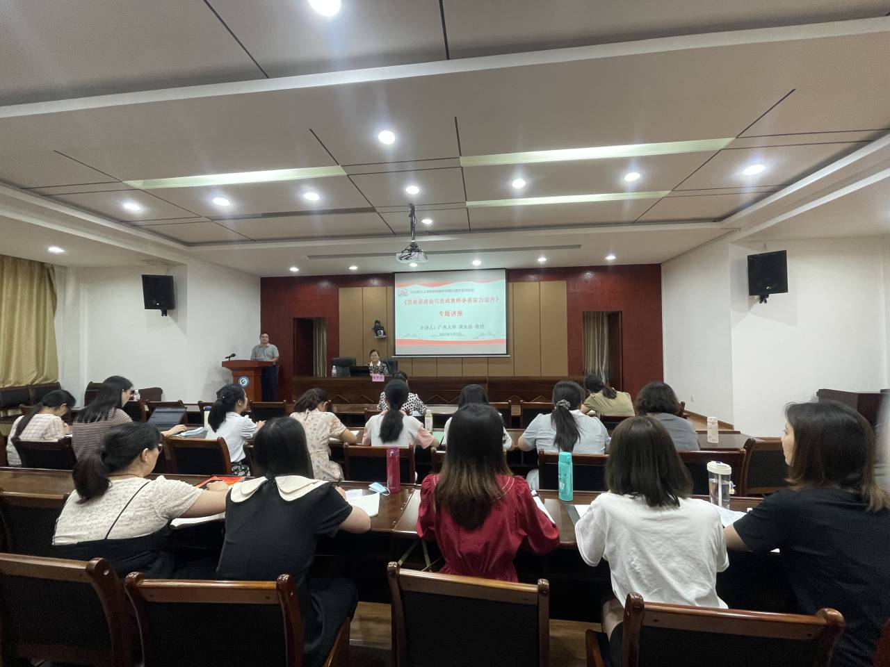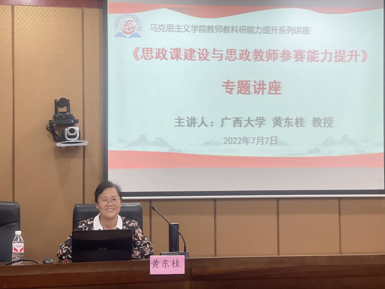 为提升马克思主义学院思政课建设水平和思政课教师教学能力,更有效地指导今年选手备赛2022年全区高校思想政治理论课教师教学基本功比赛暨“精彩一课”,7月7日下午,马克思主义学院邀请广西大学马克思主义学院硕士研究生导师黄东桂教授到校作题为“思政课建设与思政教师参赛能力提升”的专题讲座。马克思主义学院全体思政课教师参加讲座,讲座由马克思主义学院院长谢有长教授主持。