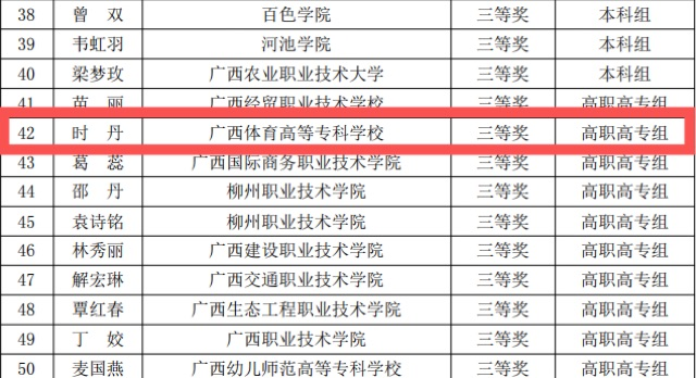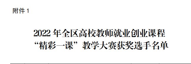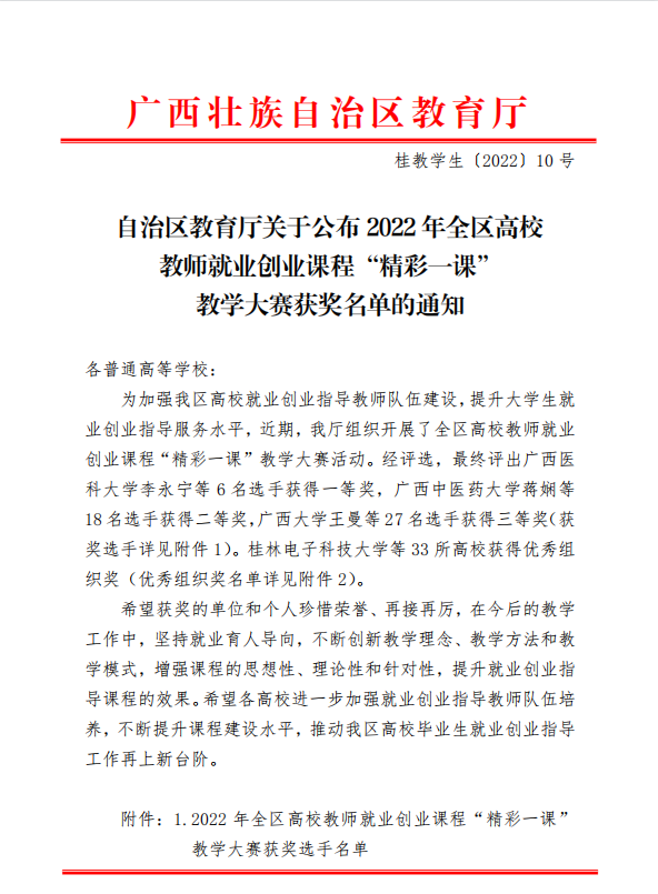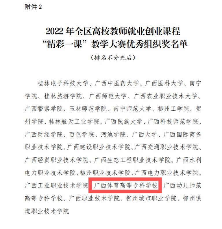 近日,自治区教育厅下发了《自治区教育厅关于公布2022年全区高校教师就业创业课程“精彩一课”教学大赛获奖名单的通知》(桂教学生〔2022〕10号),爱体育电子官方网站体育经济管理学院时丹老师荣获高职高专组三等奖,爱体育电子官方网站荣获2022年全区高校教师就业创业课程“精彩一课”教学大赛优秀组织奖。