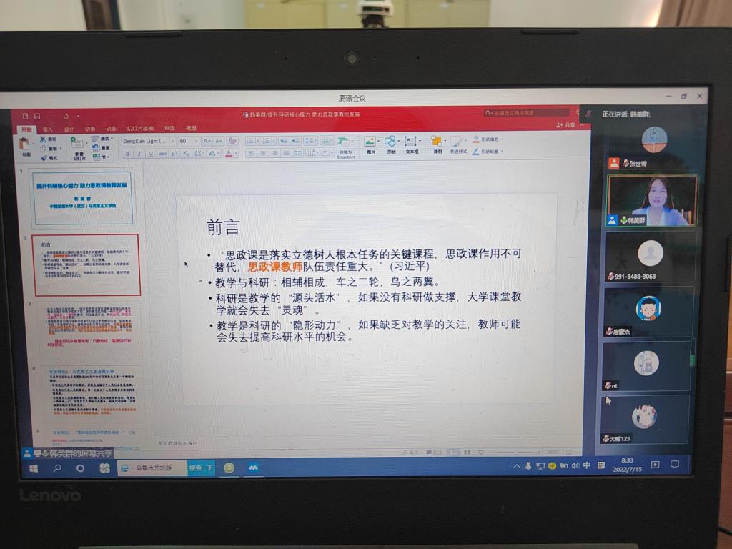 为落实立德树人根本任务,全面提升教师的教学科研能力,促进青年教师快速成长,7月13-15日,马克思主义学院依托武汉大学继续教育学院举办了教师教学科研能力提升线上专题培训。本次线上专题培训是学院教师教学科研能力提升计划重点工作之一,马克思主义学院全体教师和其他学院教师共55名全程完成了线上直播培训学习。为保证培训教学质量和学员真正学有所获,学院和武大团队密切沟通,从培训内容、师资、课程安排、直播平台,到培训考勤、课中互动、课后作业等进行了周到安排,使得本次培训班圆满完成。