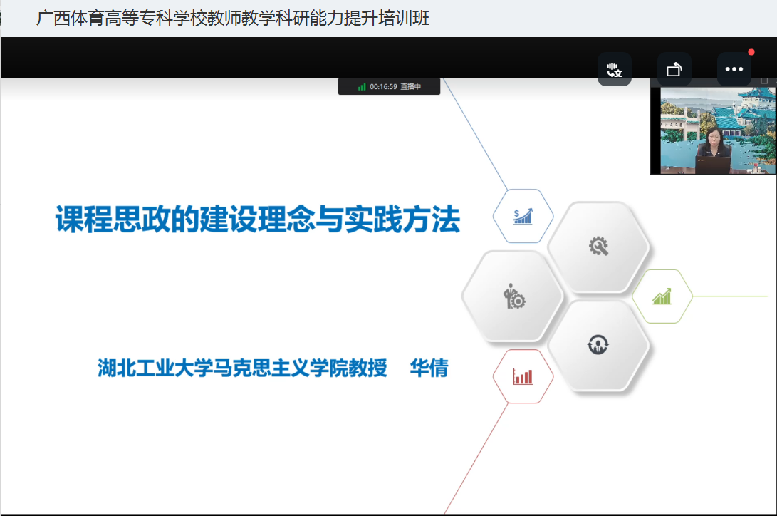 第三个专题是由青教赛国家一等奖获得者、湖北工业大学马克思主义学院华倩教授主讲,她以“课程思政的建设理念与实践方法”为主题,通过梳理课程思政提出的背景,强调课程思政的重要性,并认为课程思政并不是简单做“加法”,而是需要通过政治认同和国家意识层面、品德修养和人格养成层面、学术志向和专业伦理层面重新构建课程思政教育体系。在具体授课过程中,应注重每门课程思政元素挖掘与渗透,建立每门课程的思政案例库。