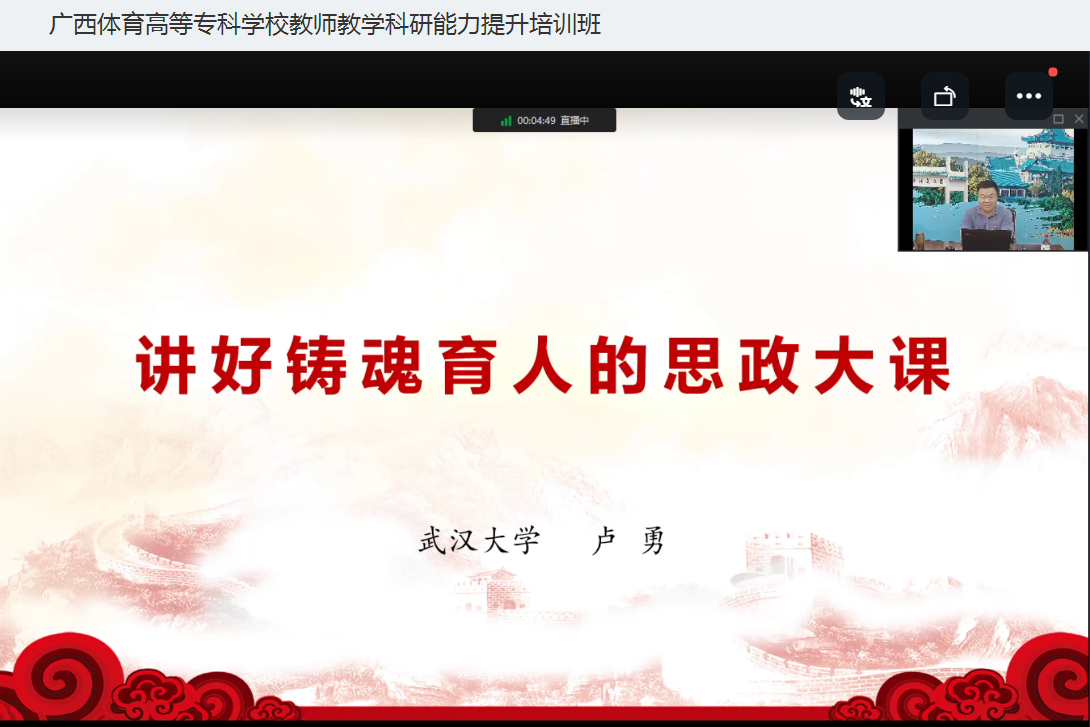 本次专题培训共分六个专题进行,第一个专题由首届全国高校思政课教学展示二等奖获得者、武汉大学马克思主义学院卢勇教授主讲。卢教授以“讲好铸魂育人的思政大课”为主题,从人与社会的维度,新时代国际国内发展维度,深刻阐释了新时代要求思政课教师要做“经师”和“人师”的统一者,要进一步增强“学科自信、专业自信、职业自信和事业自信”,要及时学习党中央各项发展政策,关注国际发展大势,结合社会发展中的现象和问题对教学理论进行解读,积极引导学生对社会发展中的问题有正确的认识,担当起铸魂育人的使命。