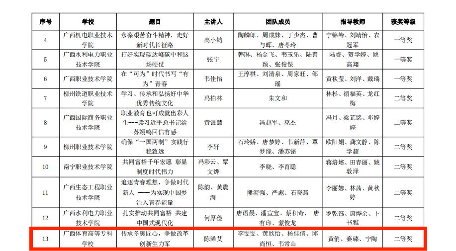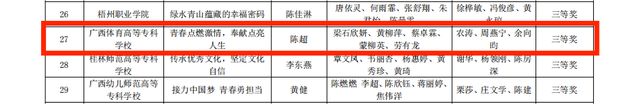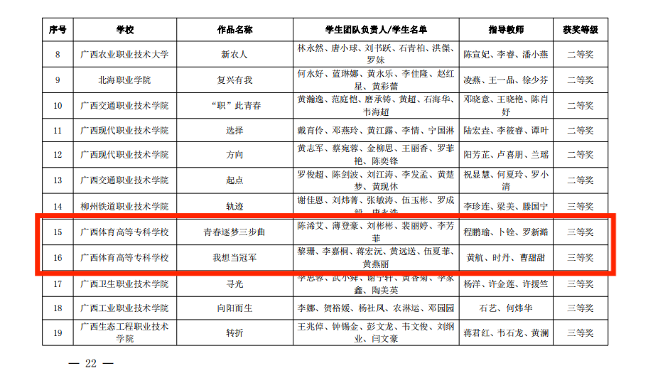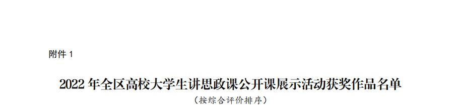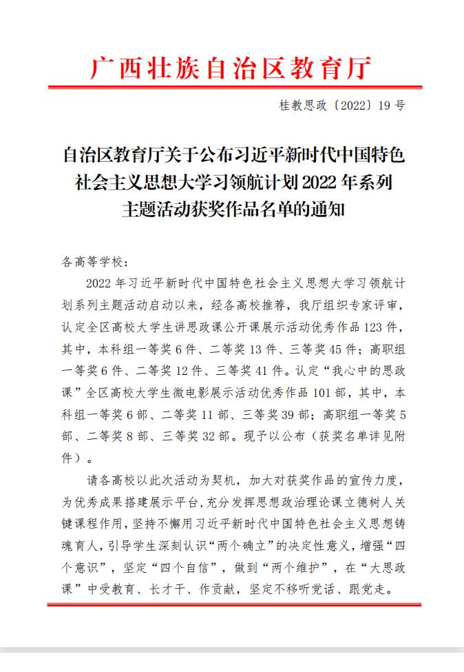 自治区教育厅发布了《关于公布习近平新时代中国特色社会主义思想大学习领航计划2022年系列主题活动获奖作品名单的通知》(桂教思政〔2022〕19号),由爱体育电子官方网站马克思主义学院教师指导学生完成的多件作品喜获佳绩。3件作品被评为2022年全区高校大学生讲思政课公开课展示活动优秀作品,其中二等奖1件、三等奖2件;2件作品为被认定为“我心中的思政课”2022年全区高校大学生微电影展示活动优秀作品三等奖。