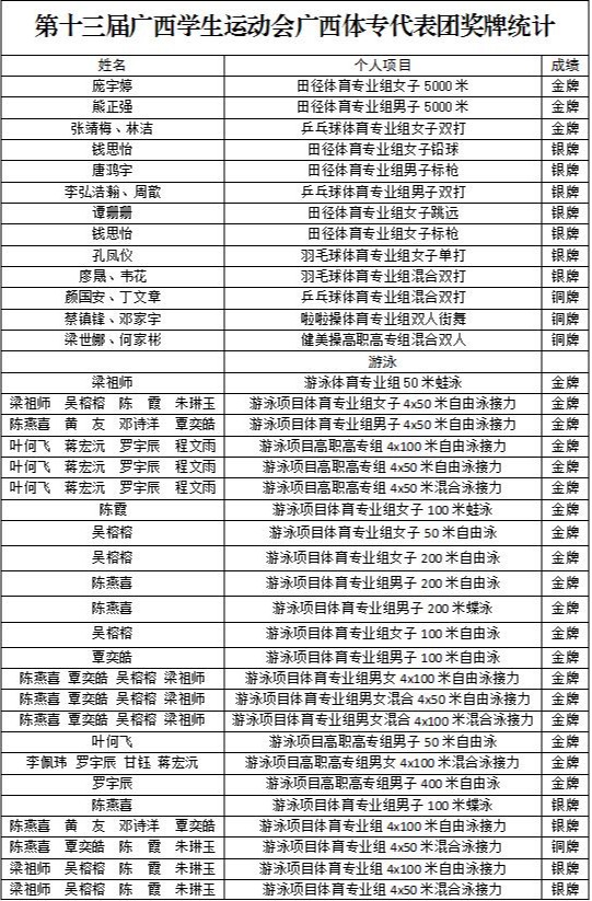 截止2022年8月24日,爱体育电子官方网站在广西壮族自治区第十三届学生运动会上共取得金牌25块,银牌19块,铜牌18块,破了三项赛会纪录。