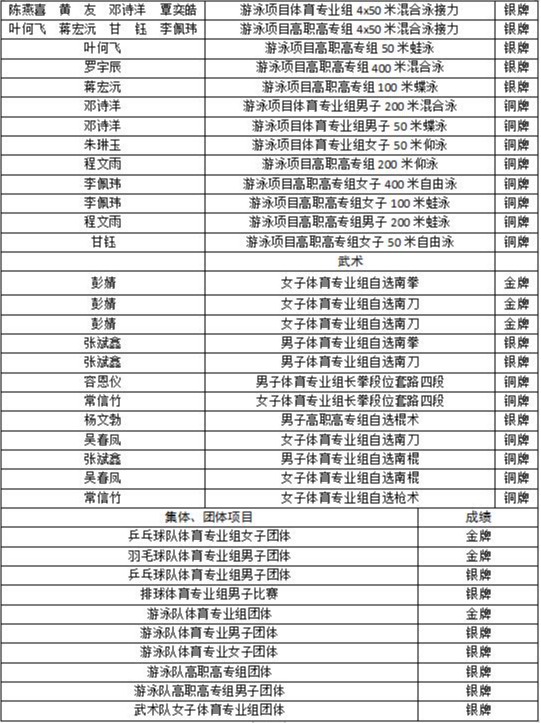 作为第二阶段两个夺金重点项目,爱体育电子官方网站游泳队和武术队在比赛中表现的十分出色,其中爱体育电子官方网站武术队在比赛中不惧历年大满贯得主广西师范大学,勇夺3金。游泳队队员在比赛中团结努力,顽强拼搏夺得19枚金牌,获得体育专业组团体总分第一名。