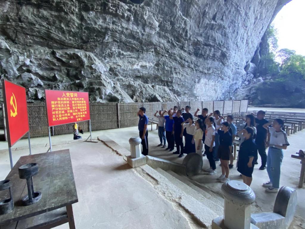 随后党员同志们前往东兰广西农民运动讲习所旧址——列宁岩。据史料记载,1925年1月,为寻求救国救民的革命真理,韦拔群、陈伯民进入广州第三届农民运动讲习所学习,结业后被委任为中央农民部特派员,派回广西开展农民运动,同年9月韦拔群在此创办了广西第一届农民运动讲习所,传播马列主义,培养农民运动骨干。在列宁岩,由支部党员黄绍华同志领读,党员同志们重温了入党誓词。