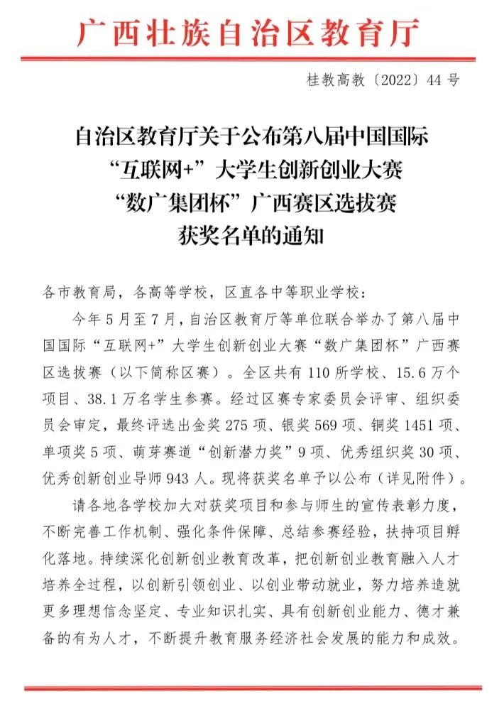为深入贯彻落实习近平总书记关于教育的重要论述,落实立德树人的根本任务,纵深推进大众创业万众创新,今年5月至7月,自治区教育厅等单位联合举办了第八届中国国际“互联网+”大学生创新创业大赛“数广集团杯”广西赛区选拔赛,爱体育电子官方网站在此次大赛中荣获4银11铜的佳绩。