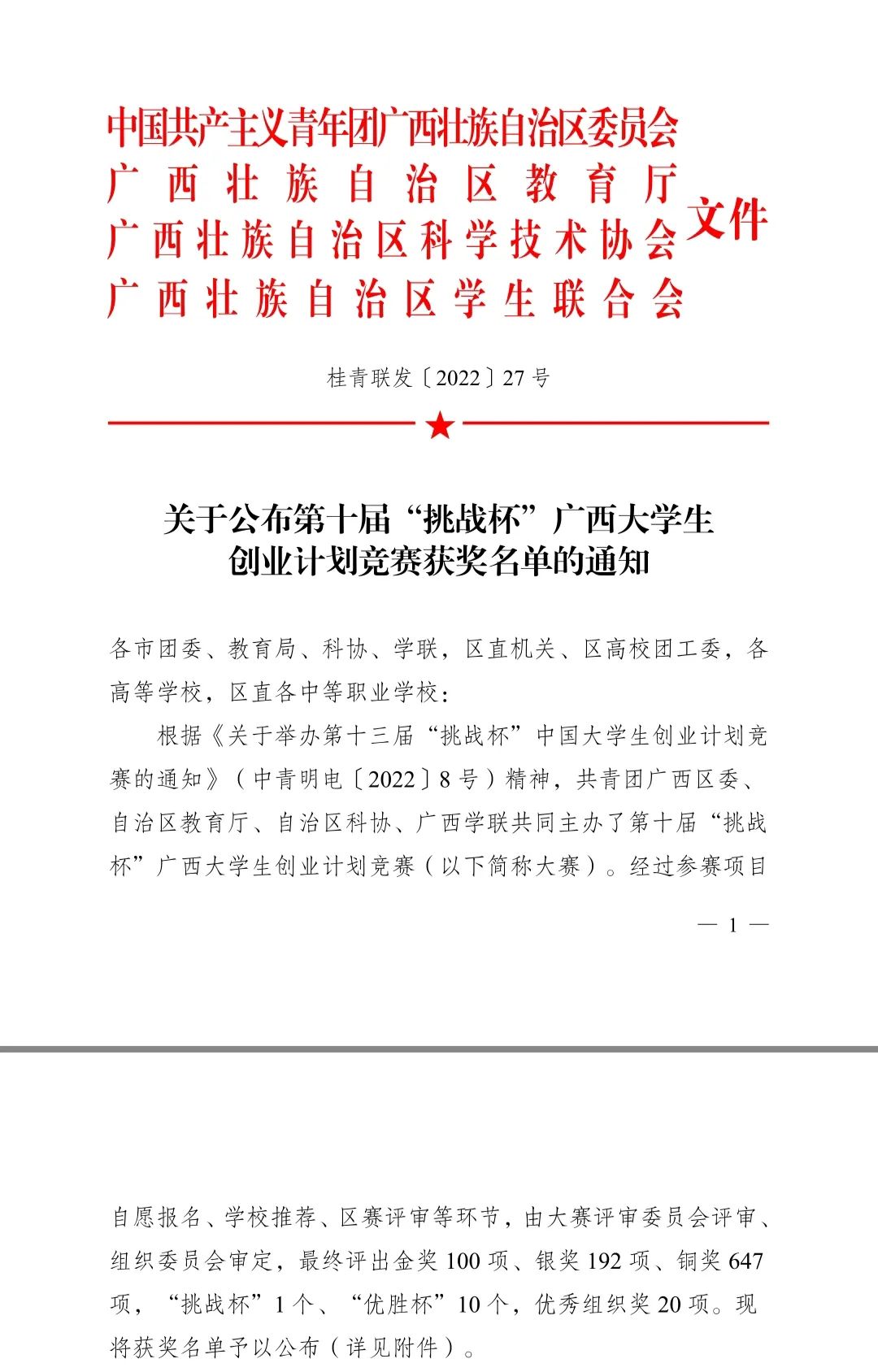 由共青团广西区委、自治区教育厅、自治区科协、广西学联共同主办的第十届“挑战杯”广西大学生创业计划竞赛获奖名单公布。爱体育电子官方网站在“挑战杯”广西大学生创业计划竞赛中再创佳绩,荣获3个金奖、2个银奖、9个铜奖。