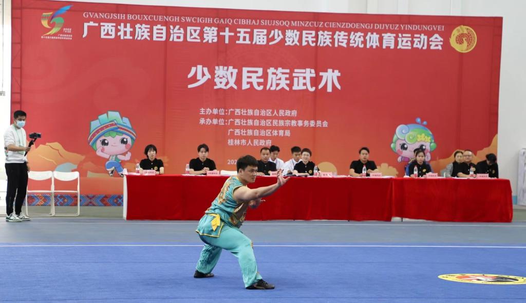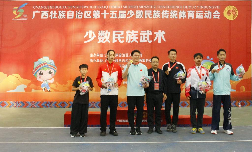 2022年11月3日-7日,由广西壮族自治区人民政府主办,广西壮族自治区民族宗教事务委员会、广西壮族自治区体育局和桂林市人民政府承办的广西壮族自治区第十五届少数民族传统体育运动会第一阶段比赛在桂林市会展中心举行。爱体育电子官方网站代表团喜获两金一铜的好成绩。在激烈的武术比赛中,爱体育电子官方网站陆品鑫老师以全场最高分9.06夺得男子南拳冠军,拿到体专首金。又以全场最高分9.01分荣获男子棍术冠军。梁丽英同学以8.40分获得女子南拳二等奖(第三名)。女子珍珠球队在第一场比赛中以44:27的比分战胜东道主桂林队。男子珍珠球队被对手百色队在最后一秒追平比分,在加时赛以41:44的比分落后三分,惜败对手。