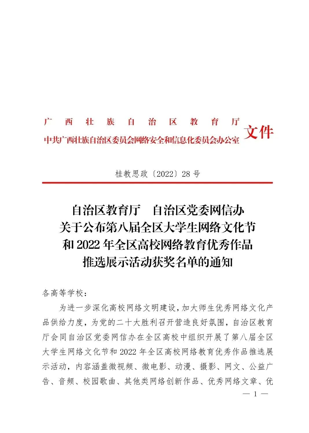 据悉,第八届全区大学生网络文化节和2022年全区高校网络教育优秀作品推选展示活动由自治区教育厅和自治区党委网信办联合举办,本次活动主题为“争做校园好网民,凝聚网络正能量,青春献礼二十大”,旨在进一步深化高校网络文明建设,加大优秀网络文化作品供给力度。