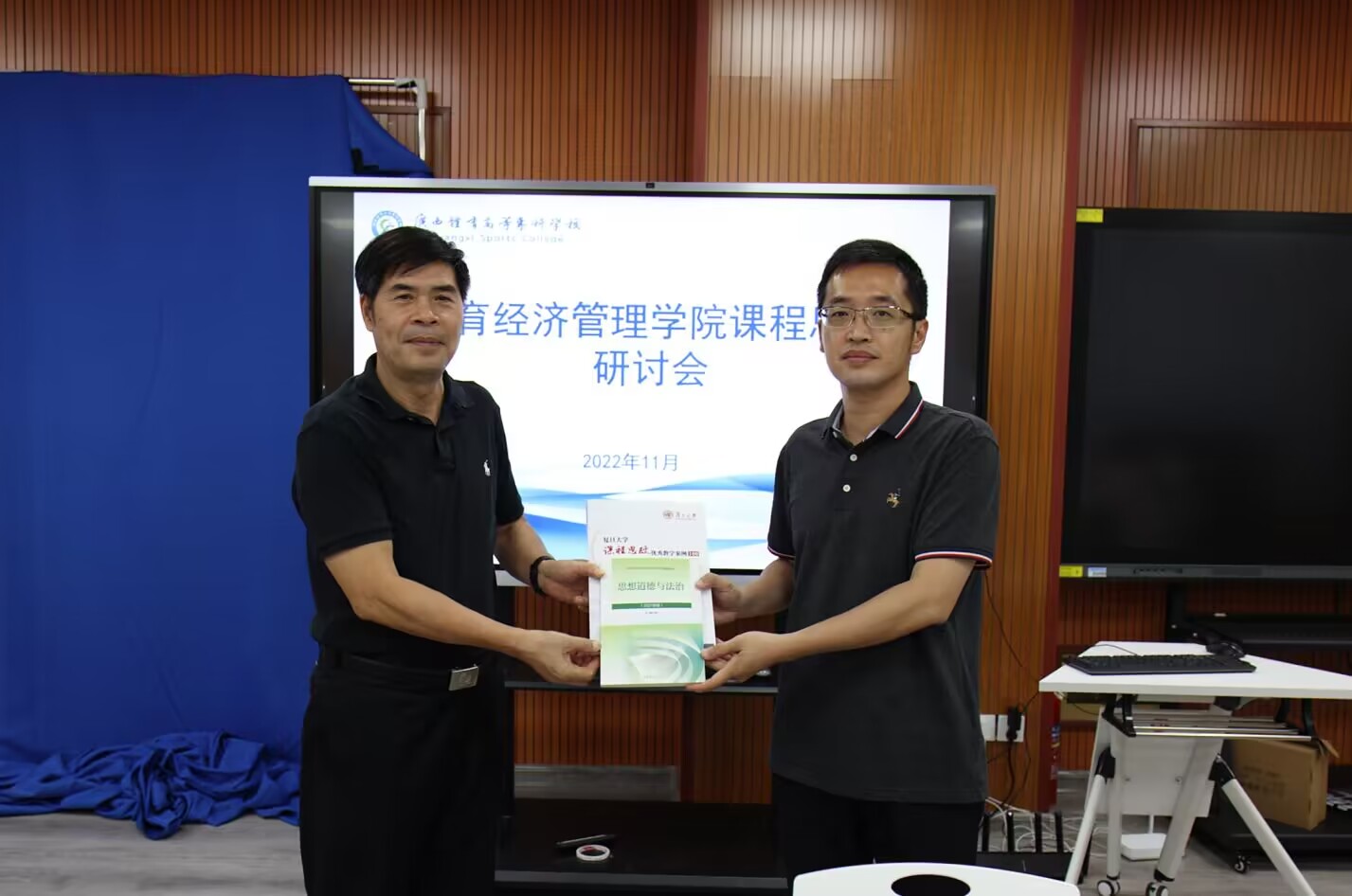 现场胡英清校长将《思想道德与法治》与《复旦大学课程思政优秀教学案例100》两本书赠予体育经济管理学院。