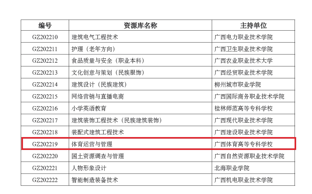 11月14日,自治区教育厅公布了2022年自治区级职业教育专业教学资源库立项建设项目名单,共立项、遴选建设32个专业教学资源库项目。爱体育电子官方网站体育经济管理学院牵头申报的体育运营与管理专业获批2022年自治区级职业教育专业教学资源库项目立项。