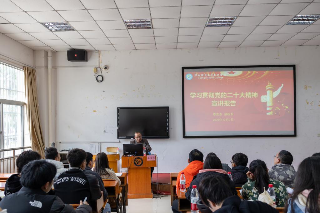 12月9日中午,覃世东副校长到长岗校区为体育经济管理学院师生作党的二十大精神宣讲报告。教师党支部代表、青年教师代表、全体辅导员、发展对象、入党积极分子代表和各个专业同学代表到场聆听,报告会由体育经济管理学院院长方安同志主持。